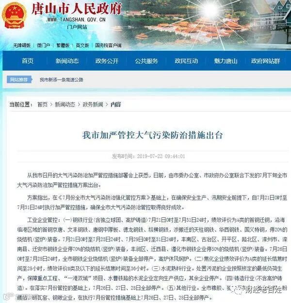产量限产后不减反增,令市场质疑唐山限产的执行力度。而最近有关“唐银钢铁总经理被刑拘”的消息在钢铁圈炸开了锅,有消息称19日环安支队现场检查发现三座高炉未按要求停限产,而随着这一事件的发酵,对其他限产不严格企业也会有一定的震慑作用,与此同时,唐山市对7月下旬大气污染防治工作做了进一步加严部署:7月21日0时至7月31日24时执行加严管控措施。除A类企业停20%的烧结机(竖炉)装备外,7月26日0时至7月28日24时,全市钢铁企业烧结机(竖炉)装备全部停产,高炉休风焖炉。