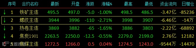 昨日夜盘,黑色系迎来重挫,钢材板块跌幅居前,今日虽略有反弹,但除了焦煤勉强翻红外,其余品种均收跌。其中,螺纹钢1901在昨日录得近10个交易日的低点3998后,今日盘初更是触及两月低点的3907,收市报3944(-2.71%,-110)。从日k线观察,螺1901连续寄出大阴线,破位下跌势头凸显。