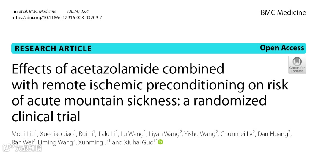 Moqi Liu, Xueqiao Jiao, Rui Li, Jialu Li, Lu Wang, Liyan Wang, Yishu Wang, Chunmei Lv, Dan Huang,Ran Wei, Liming Wang, Xunming Ji & Xiuhai Guo. Effects of acetazolamide combined with remote ischemic preconditioning on risk of acute mountain sickness: a randomized clinical trial. BMC Medicine, 2024, Vol 22, Issue 1, p1; https://doi.org/10.1186/s12916-023-03209-7