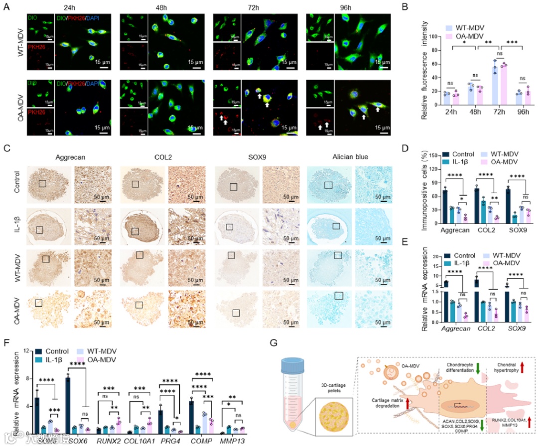 将OA-MDVs与C28/I2软骨细胞体外共培养后,PKH26荧光标记及内吞和膜融合抑制实验对比后表明OA-MDVs主要通过吞噬和直接膜融合进入软骨细胞;免疫组化及qPCR结果显示OA-MDV处理后显著抑制软骨基质合成、下调关键转录因子、促进肥大化和降解表型,加剧OA软骨退变。