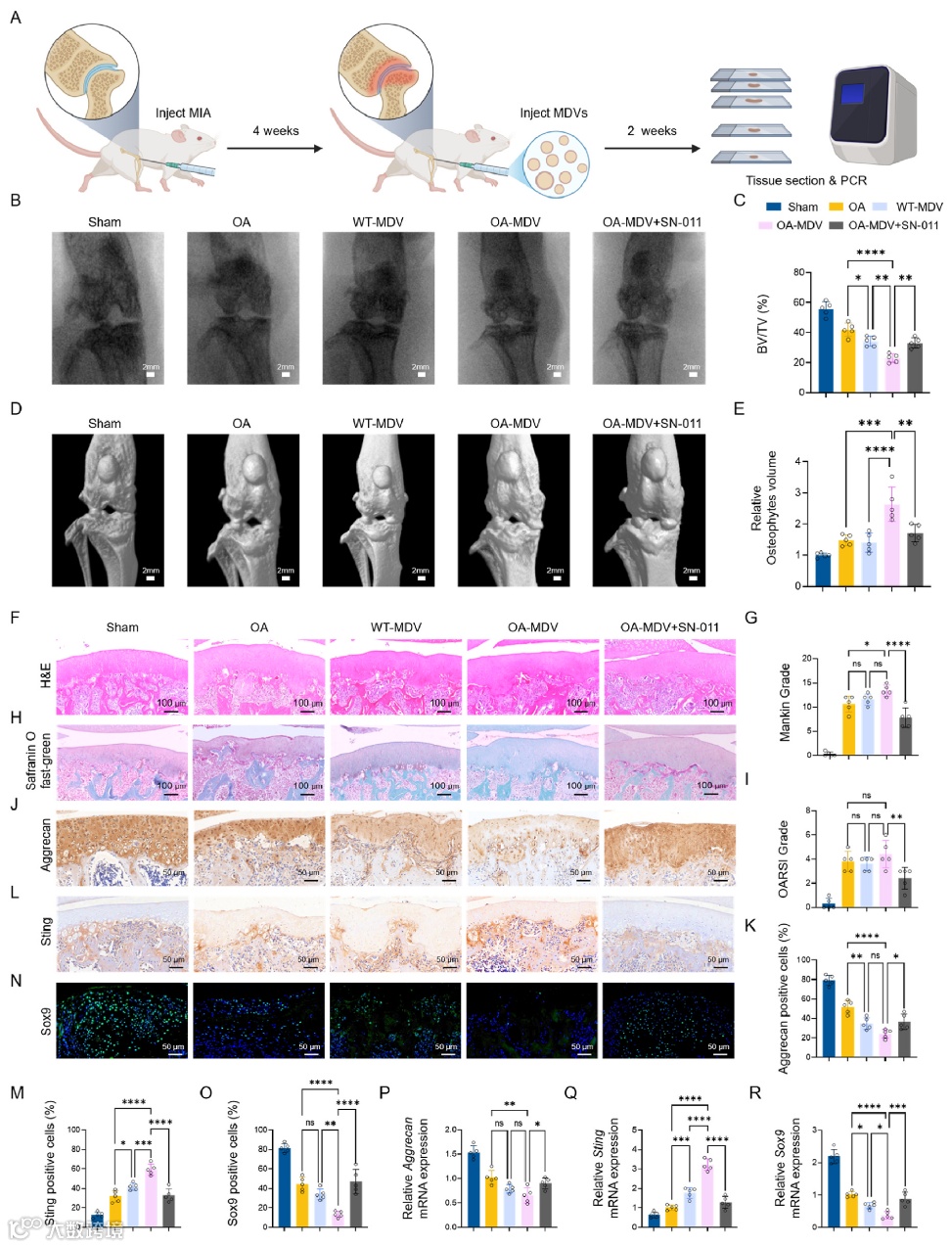 IF分析、WB及转录水平分析显示OA‑MDVs注射组中蛋白聚糖、Sox9等软骨合成标志物含量下降,炎症反应显著增强,SN‑011(STING抑制剂)可逆转MDVs引起的关节破坏和炎症反应。