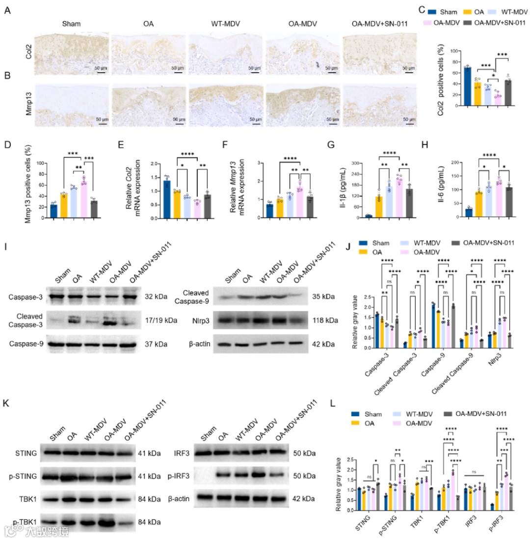 结合蛋白芯片分析,这些数据共同表明,OA‑MDVs主要通过cGAS‑STING通路加剧细胞外基质降解、氧化应激和软骨细胞凋亡,而SN‑011可有效缓解这些病理过程。