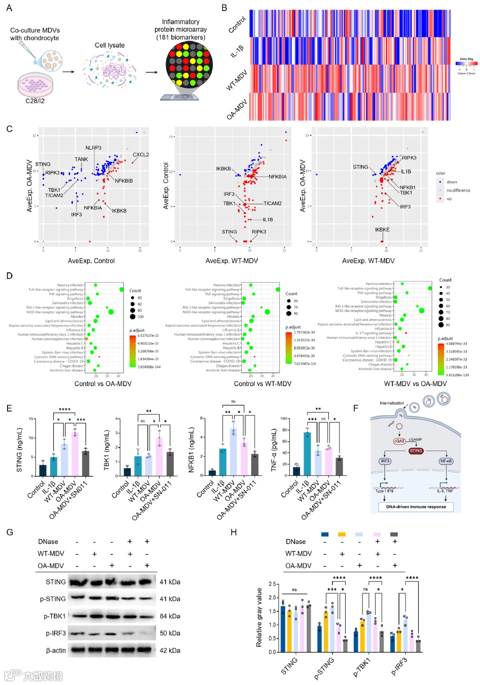 利用抗体芯片AAH-BLG-TOL(检测人类样本中181个 炎症及Toll/NOD-like 受体通路相关因子)对MDVs共培养的软骨细胞中微量功能表达细胞因子进行分析,发现OA-MDV组主要上调炎症通路相关蛋白,如STING、RIPK3、TANK、IRF3和TBK1;WT-MDV组则高表达RIPK3、TBK1、NFKB1、IL-1β等炎症相关蛋白。DEPs的KEGG分析发各组现在“胞质DNA感知通路”中均存在显著差异,结合ELISA、WB实验证明了MDVs处理可强烈激活STING通路,表现为磷酸化STING、TBK1和IRF3水平升高,MDVs可通过mtDNA激活cGAS–STING通路作用于软骨细胞,驱动炎症级联反应,促进OA进展。