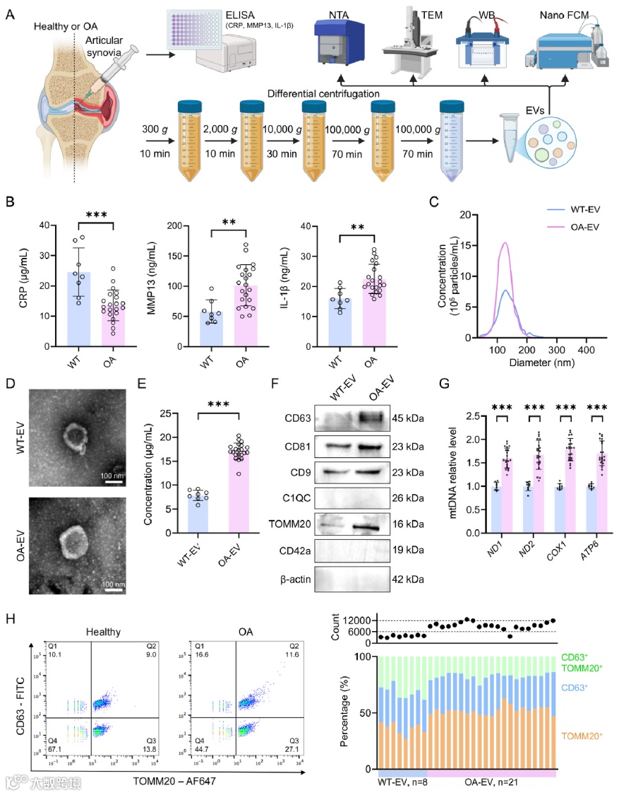 从OA患者和创伤患者(对照组)的滑膜液中分离EVs,并通过纳米粒子追踪分析(NTA)、透射电镜(TEM)和WB分析表征。结果显示OA患者滑膜液中EVs数量显著增加,且富含线粒体标记蛋白TOMM20,提示MDVs亚群增多。