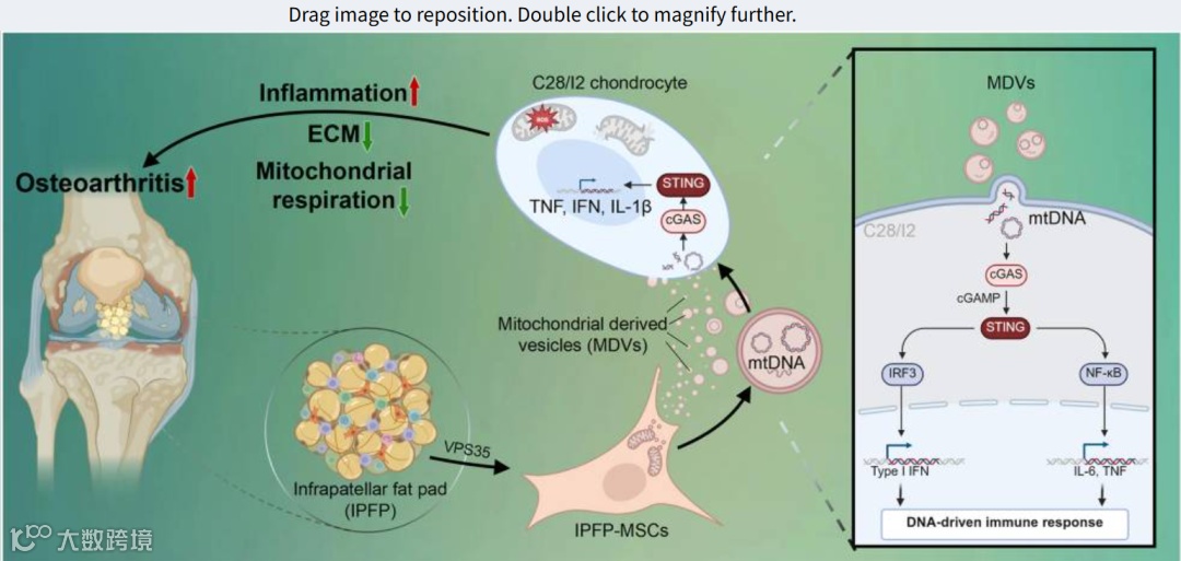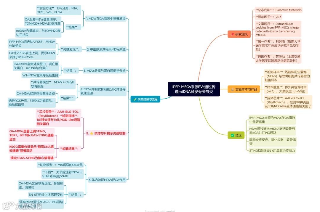 本研究首次揭示,在骨关节炎(OA)患者的滑液及髌下脂肪垫间充质干细胞(IPFP-MSCs)来源的细胞外囊泡(EVs)中,线粒体来源囊泡(MDVs)作为一种独特的EV亚群显著富集,并通过传递线粒体DNA(mtDNA)激活软骨细胞中的cGAS-STING信号通路,从而驱动OA的炎症进展与软骨退变。