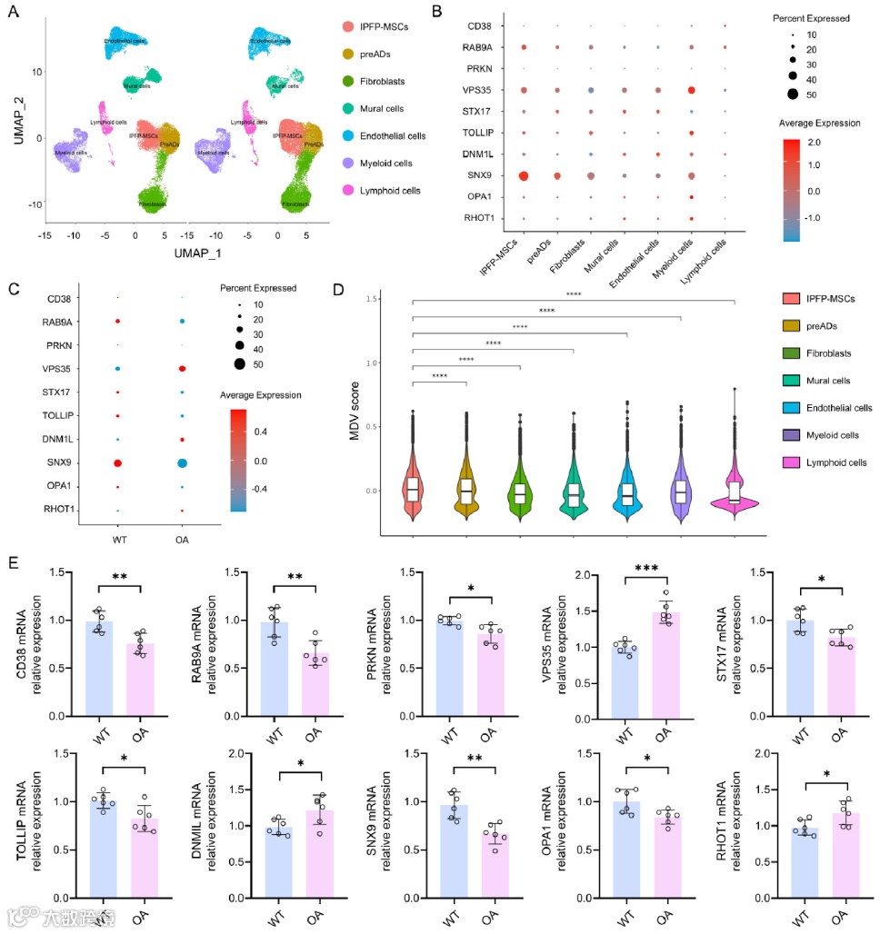 单细胞RNA-seq分析显示,VSP35 表达与 MDV 数量之间存在一致的规律关系,OA患者IPFP-MSCs中MDV生成相关基因(如VPS35)表达上调,提示IPFP-MSCs是滑膜液中MDVs的主要细胞来源。