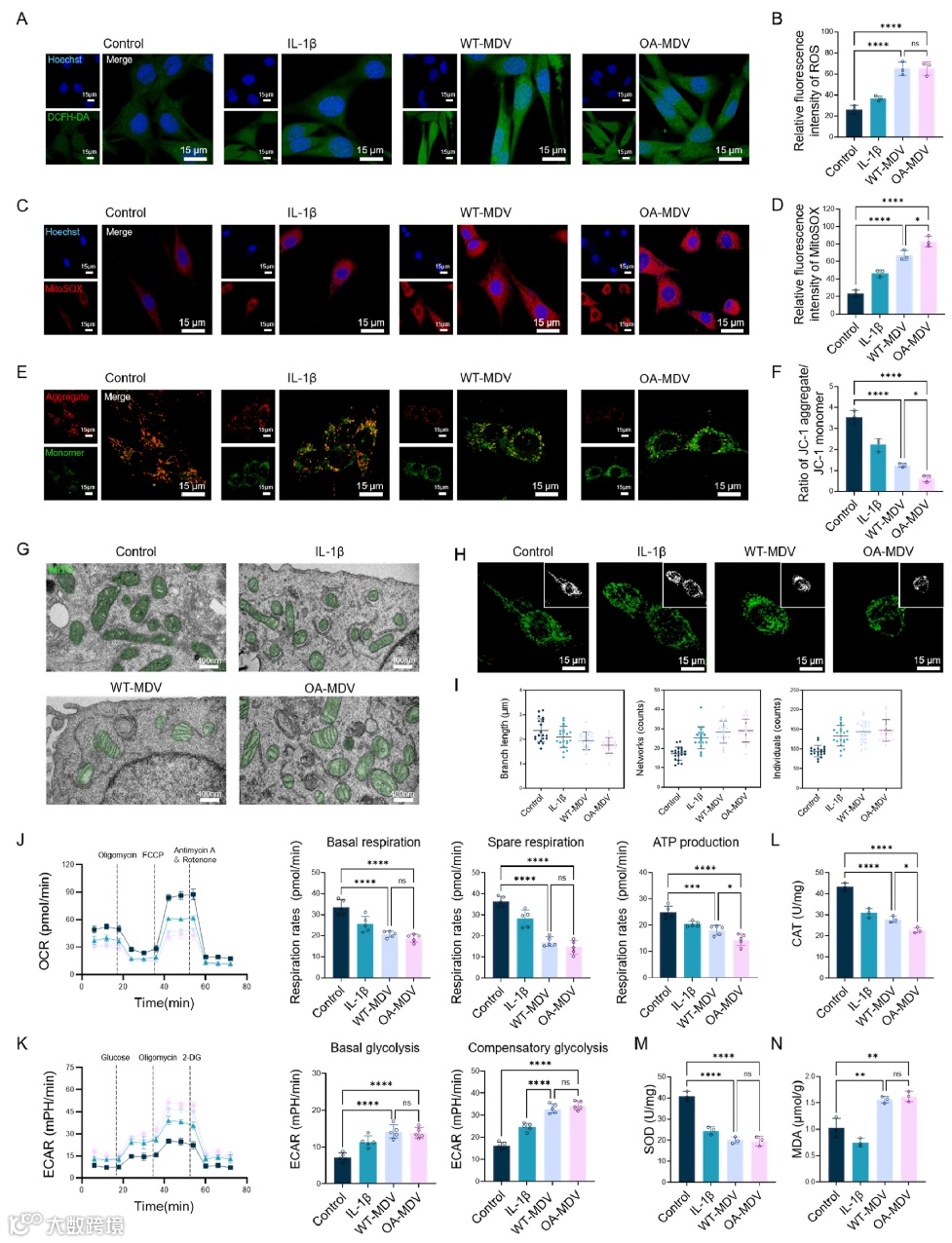 ROS水平检测及能量代谢分析发现显示OA-MDVs诱导线粒体氧化加剧,结构异化,糖酵解代偿增强。