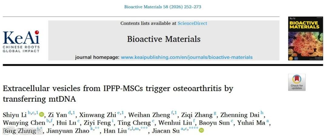 文章题目:Extracellular vesicles from IPFP-MSCs trigger osteoarthritis by transferring mtDNA