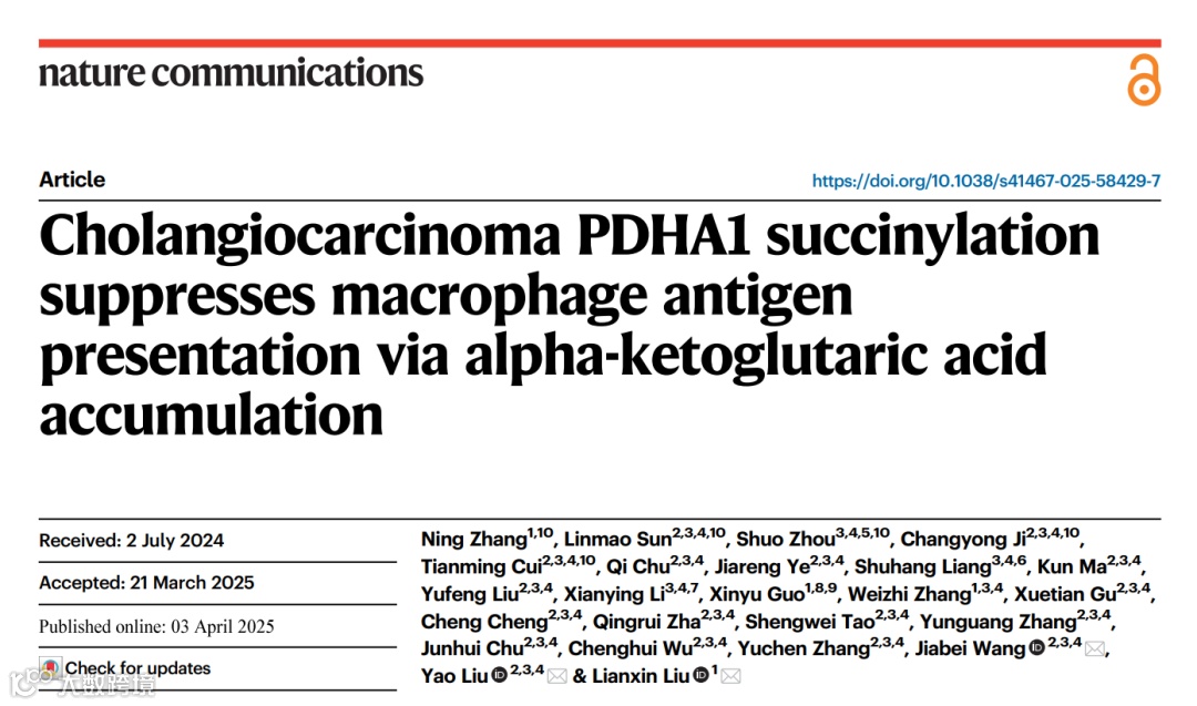 英文题目:Cholangiocarcinoma PDHA1 succinylation suppresses macrophage antigen presentation via alpha-ketoglutaric acid accumulation