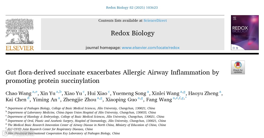[1] Chao Wang, Xin Yu, Xiao Yu, Hui Xiao, Yuemeng Song, Xinlei Wang, Haoyu Zheng, Kai Chen, Yiming An, Zhengjie Zhou, Xiaoping Guo, Fang Wang. Gut flora-derived succinate exacerbates Allergic Airway Inflammation by promoting protein succinylation. Redox Biology 82 (2025) 103623. http://doi.org/10.1016/j.redox.2025.103623