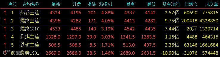 今日钢材期货强势爆发。热卷主力盘中暴涨5%,收市涨4.88%!螺纹钢1901大涨4.38%冲上4400,近月1810涨3.21%报4534!铁矿、双焦同样上涨!唐山方坯延续升势,涨至4110元/吨。