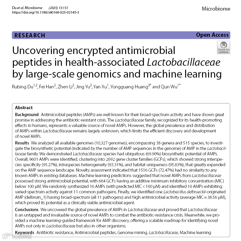 2025年6月21日,《Microbiome》发表了来自江南大学团队的研究“Uncovering encrypted antimicrobial peptides in health-associated Lactobacillaceae by large-scale genomics and machine learning”。该研究分析了乳杆菌科所有可用的基因组(包括单菌基因组和MAGs),揭示了乳杆菌科中抗菌肽的全球分布情况,并证明乳杆菌科是应对抗生素耐药性危机的新型抗菌肽的未开发且极具价值的来源。