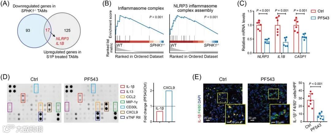 利用AAM-INF-1炎症多因子检测及RNA测序分析表明,SPHK1缺失或抑制降低NLRP3和IL-1β的表达(图4A-D)。