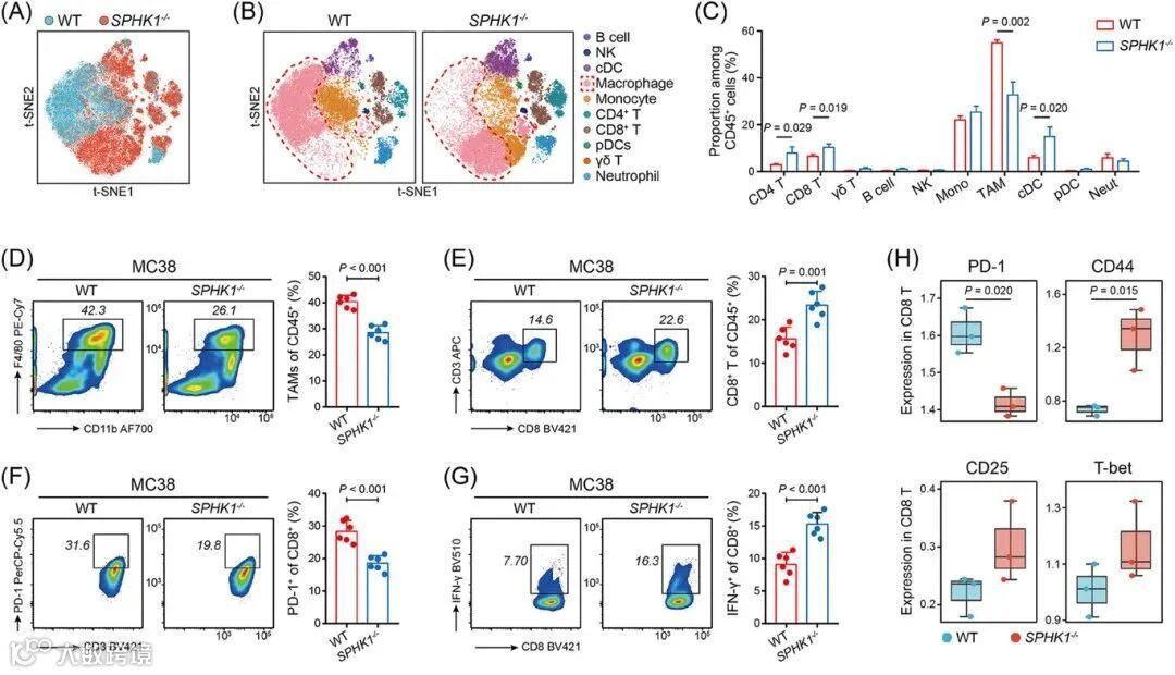 质谱流式(CyTOF)和流式分析显示,SPHK1缺失导致TAMs减少,CD8+ T细胞浸润增加,且CD8+ T细胞耗竭标志物(PD-1、TIM3)下调,效应分子(IFN-γ、GZMB)上调(图3A-H)。
