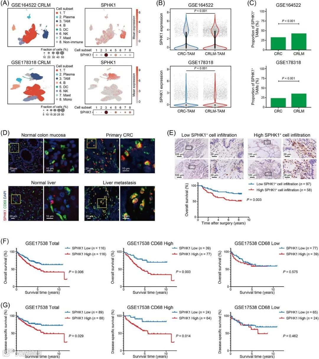 临床数据分析显示,SPHK1高表达的CRC患者总体生存率较低,尤其在CD68高表达的亚组中预后更差(图1E-G)。