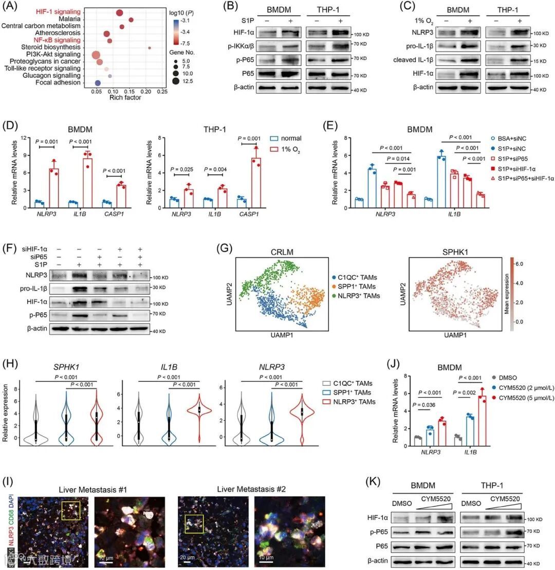 S1P通过结合S1PR2激活NF-κB和HIF-1α信号通路,促进NLRP3炎症小体组装和IL-1β分泌(图5A-K)。