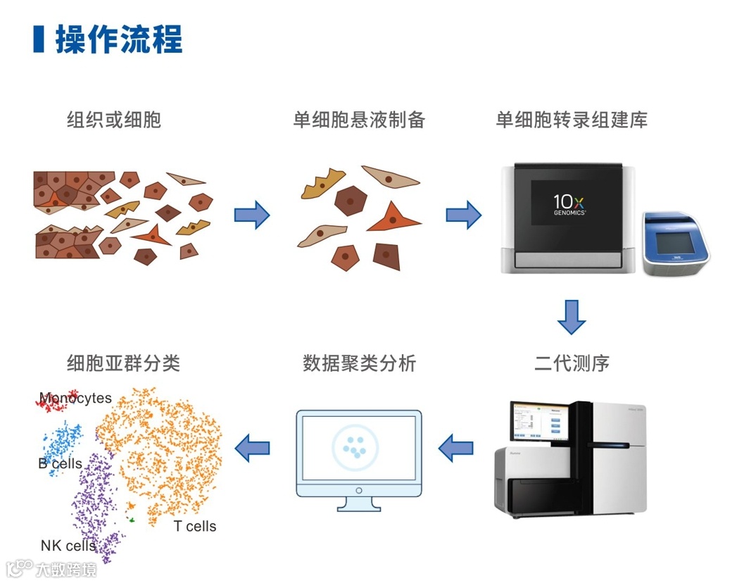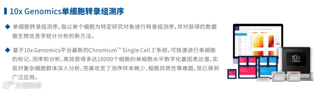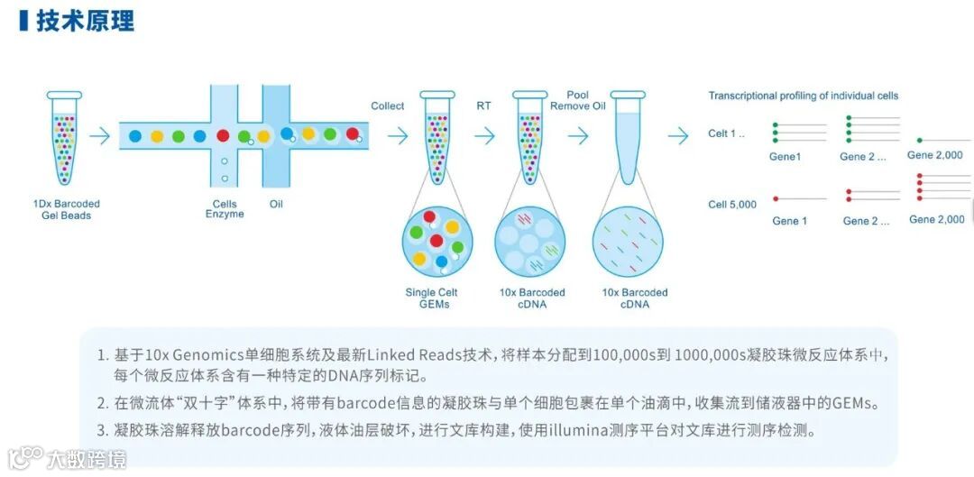 利用10×Genomics 技术平台,提供单细胞转录组测序服务,并可根据研究者的需求提供生物信息学分析服务。10×Genomics 单细胞转录组测序兼具通量高(可同时上8个样本,每个样本可获得10000个细胞转录组数据)、周期短(最快1-2天完成文库构建)、效率高(单个细胞捕获率高达65%)、Low Double Rate(一滴油珠包含2个细胞的几率)0.8%/1000个细胞、性价比高等诸多优势,是目前单细胞测序最为成熟和主流的技术之一。