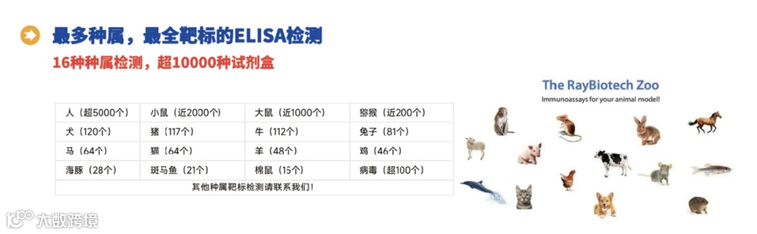 由于ELISA与抗体芯片均系利用免疫分析原理,也可简单理解为抗体芯片即高通量的ELISA,因此,凡夹心法抗体芯片能够覆盖的检测靶标理论上均在ELISA试剂盒产品覆盖范围内。而我们拥有超过16个不同种属多达万余款不同的ELISA Kits,为全球最全,满足各种蛋白检测需要。
