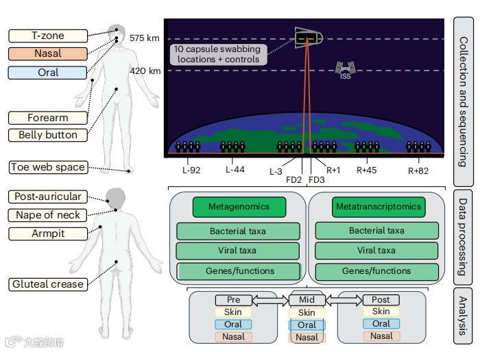 近期发表于《Nature Microbiology》的一项研究,就为我们提供了一个绝佳范例。该研究聚焦短期航天飞行,巧妙地以 4 名宇航员的口腔、鼻腔、皮肤拭子及粪便作为样本,看似常规的实验设计,却凭借 750 个大样本量与宏基因组、宏转录组、单细胞转录组等多组学技术的巧妙结合,首次深度解析了太空飞行中宿主微生物组结构和免疫反应的变化规律。