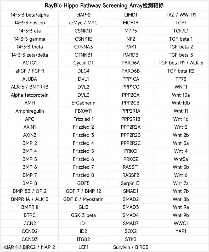 RayBio Hippo通路专用检测试剂盒,仅需60μg总蛋白,即可检测胞内外Hippo通路118个上下游核心蛋白表达水平,精准、高效、全面!