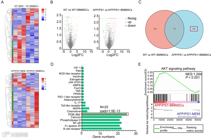 RNA测序分析显示,BMMSCs移植显著改变了海马体中的基因表达谱,特别是与细胞生长、伤口愈合和AKT信号通路相关的基因。GSEA分析进一步证实了AKT信号通路的激活。