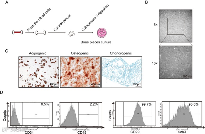 BMMSCs的分离和验证:从小鼠股骨和胫骨中分离BMMSCs,并通过流式细胞术检测其表面标志物(CD29、Sca I、CD90、CD73、CD34和CD45)。