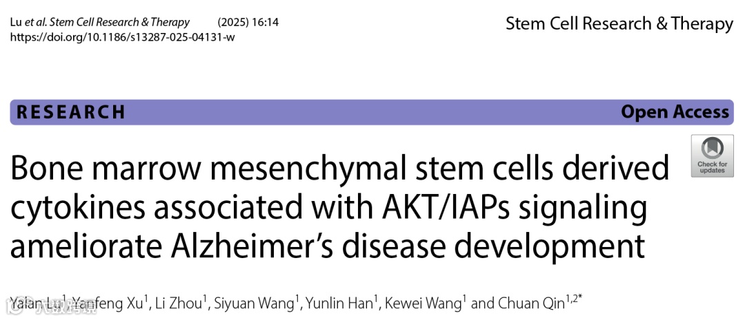 文章信息:Lu Y, Xu Y, Zhou L, Wang S, Han Y, Wang K, Qin C. Bone marrow mesenchymal stem cells derived cytokines associated with AKT/IAPs signaling ameliorate Alzheimer’s disease development. Stem Cell Research & Therapy. 2025 Jan 23;16(1):14.