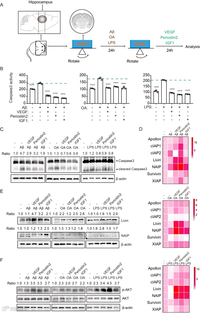 脑片培养和诱导:将小鼠脑片在Aβ、OA和LPS诱导下培养,并用IGF1、VEGF和Periostin2处理,评估其对神经元凋亡的影响。