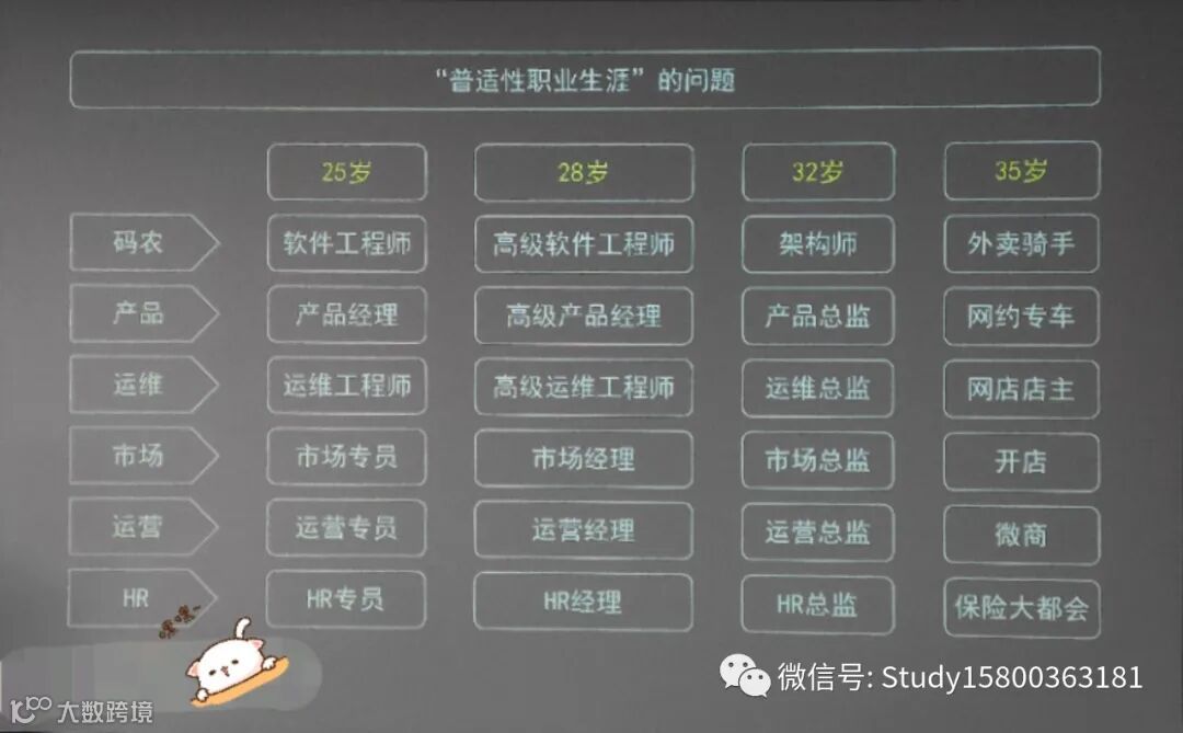 通过某人力公司的数据跟踪调查,发现了目前在职业发展中,不同的职业发展走向.不同职位的职业走向有着不同的变化.像:码农、产品、运维、市场、运营、HR等职位在35岁时有趣的职业发展走向.