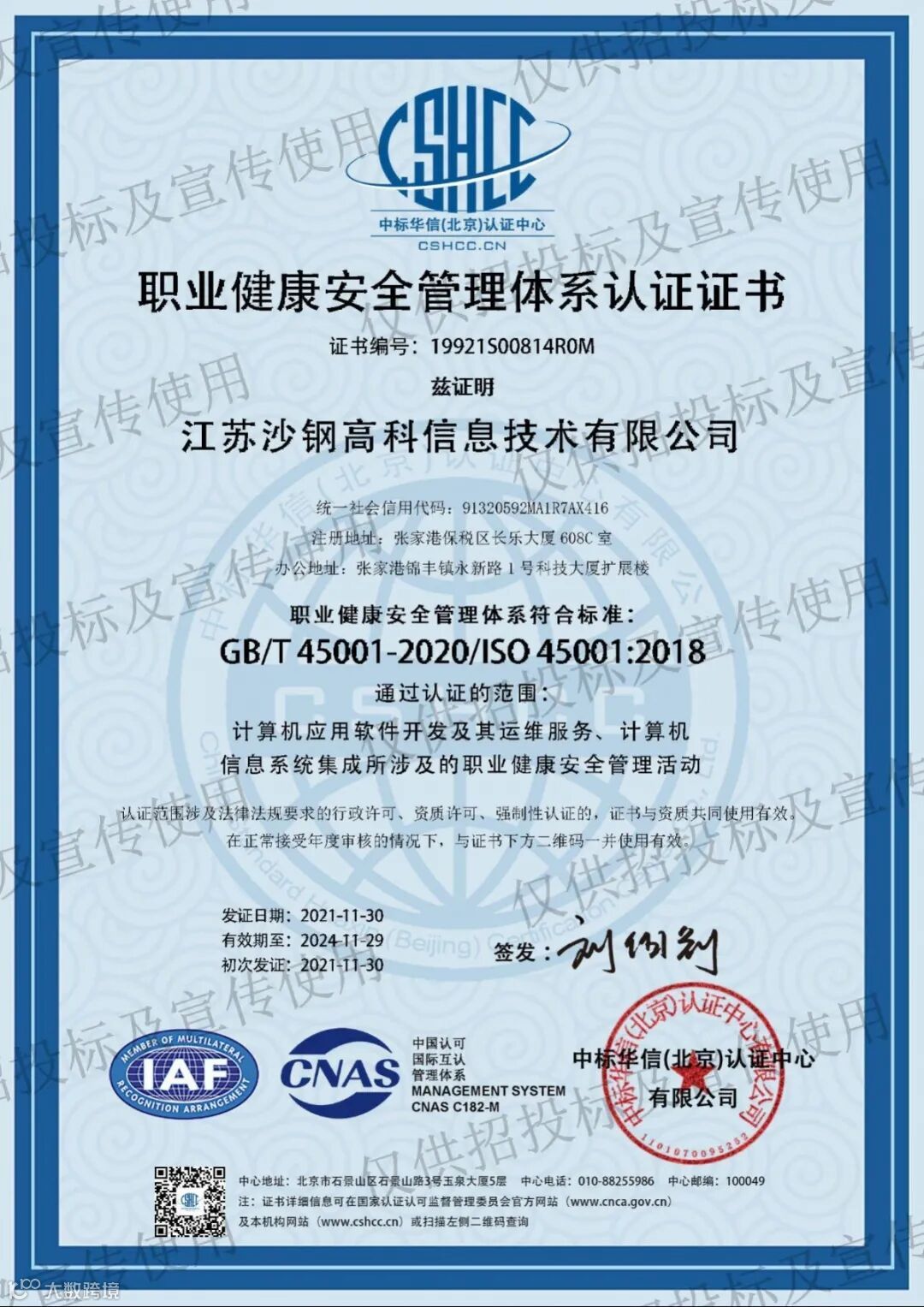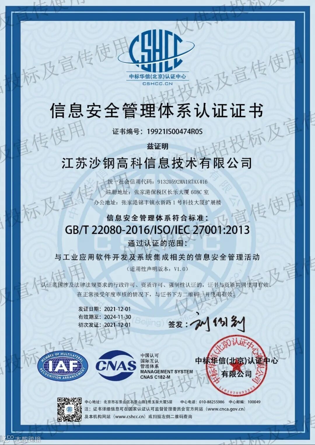 日前,江苏沙钢高科信息技术有限公司顺利通过由中标华信(北京)认证中心有限公司的信息安全、质量、职业健康安全三大管理体系认证,标志着沙钢信息化项目执行质量、内部管理水平和市场竞争力跃上新的台阶。