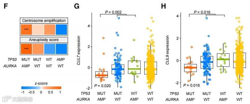 转录组和蛋白组的GSEA分析显示TP53mut-AURKAamp携带者在细胞周期G2/M pathway中显著上调;同时具有较高的中心体扩增评分和非整倍性评分,在已报的整倍性相关基因CUL7 and CUL9中显著降低;由于中心体扩增是耐药的潜在因素,这些发现表明中心体扩增可能是TP53mut-AURKAamp诱导内分泌治疗耐药的机制。