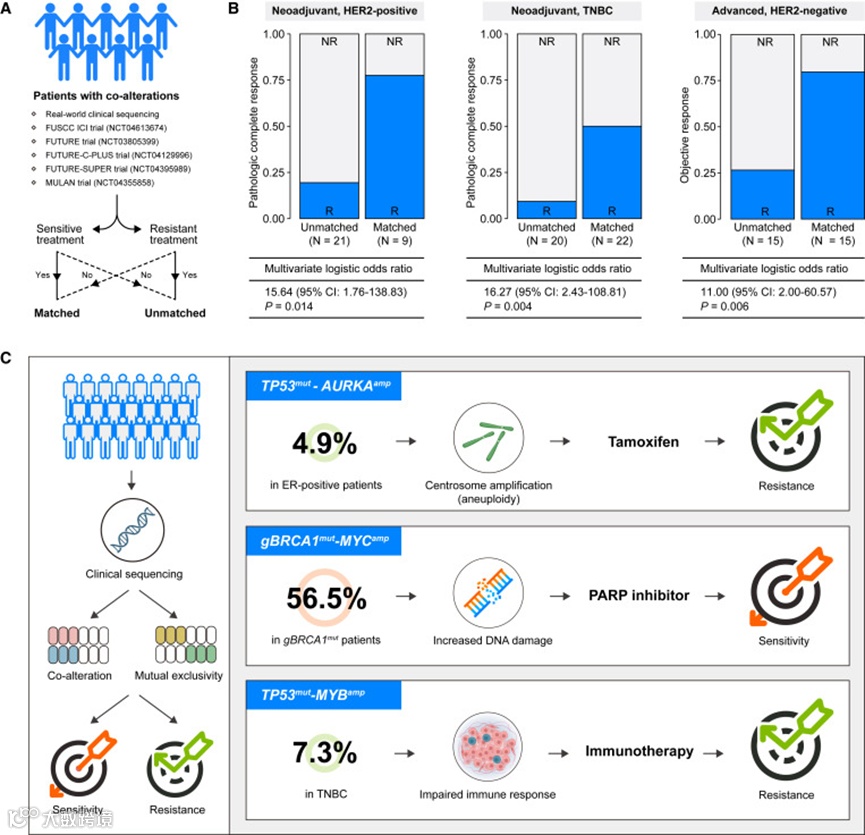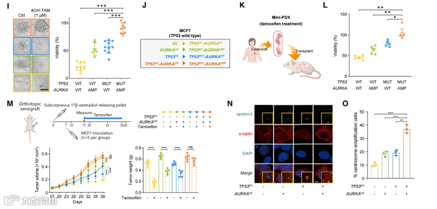 为了验证共改变对治疗敏感性的影响,研究者还使用体外细胞系、PDOs、mini-PDX、体内异种移植模型进行了药物反应测试。比如通过细胞存活率、肿瘤体积、细胞中心体水平等指标,证明了TP53突变和AURKA扩增的共变异显著降低了乳腺癌模型对他莫昔芬的敏感性,导致治疗效果下降,这种耐药性可能与这些基因变异引起的细胞周期调控异常和中心体扩增有关。