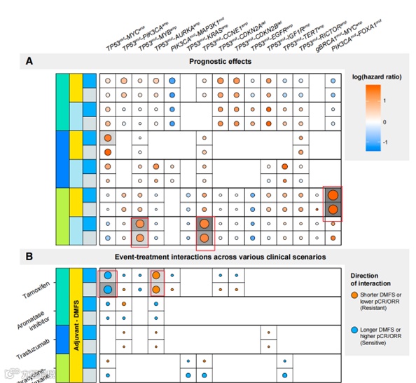接下来,研究者对这些互作与生存及各种临床情景的关联进行了探索:发现PIK3CAmut-FOXA1mut 与较差的DMFS相关,TP53mut-MYBamp 和TP53mut-CCNE1amp 在三阴乳腺癌亚型中与较差的OS相关;并且,对于不同的肿瘤亚型,携带互作变异的不同对治疗反应的也不同,如在HR+HER2-亚型患者中,采用Tamoxinfen辅助治疗,TP53mut-AURKAamp携带者依然较差的预后,而TP53mut-MYCamp具有较好的临床效果。