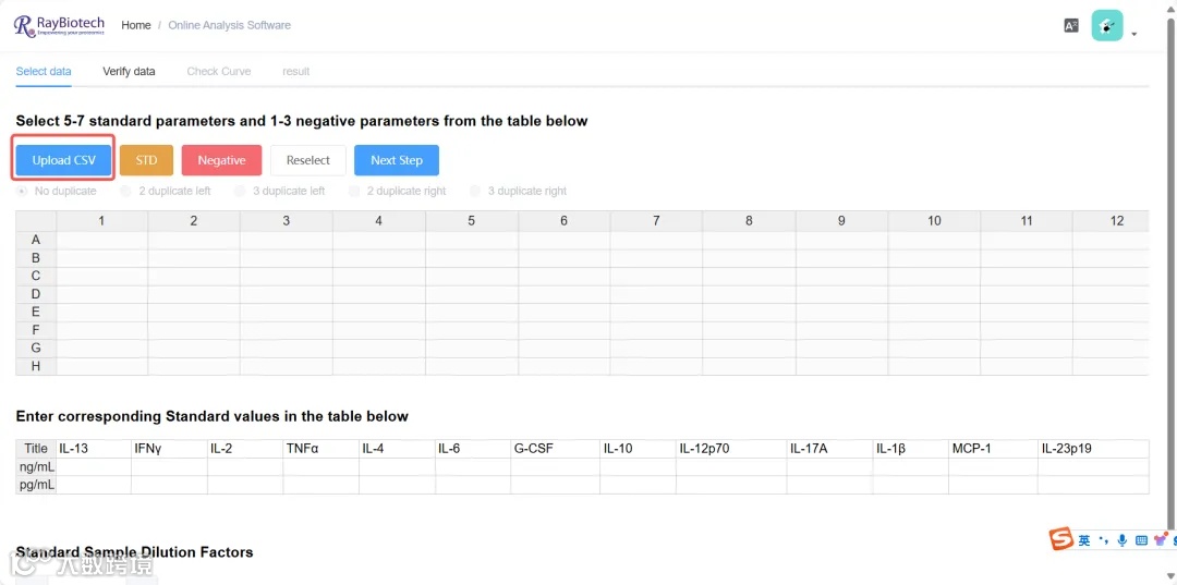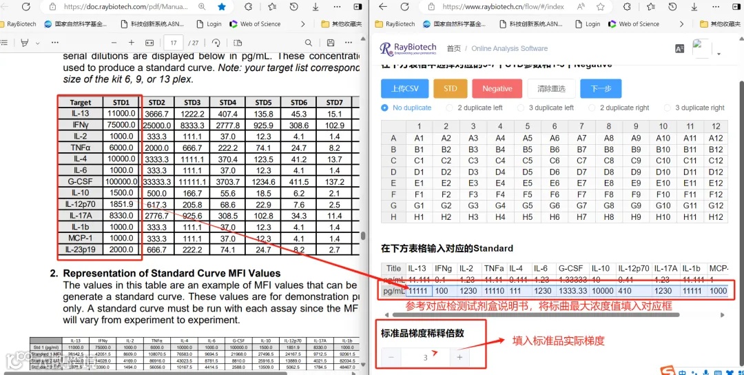标曲靶标名称自动识别,空白处填写各个靶标标准曲线梯度的最大浓度,参考对应货号说明书输入即可,选择标准曲线对应的单位(ng/m或pg/ml),说明书标准品稀释倍数默认为“3”(以实验中实际标曲梯度为准)