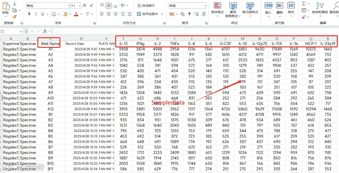 通过流式仪自带软件或者“FlowJo”下载原始数据CSV格式,主要关注的信息为各个样本对应的孔槽(Well ID)及每个样本检测的所有因子的MFI数据(Sample Data)。