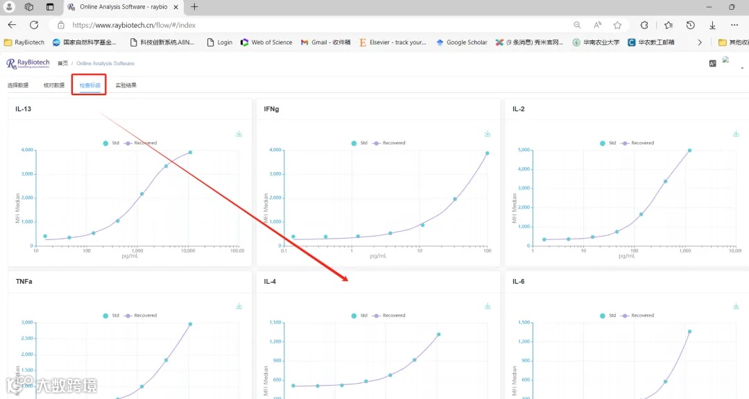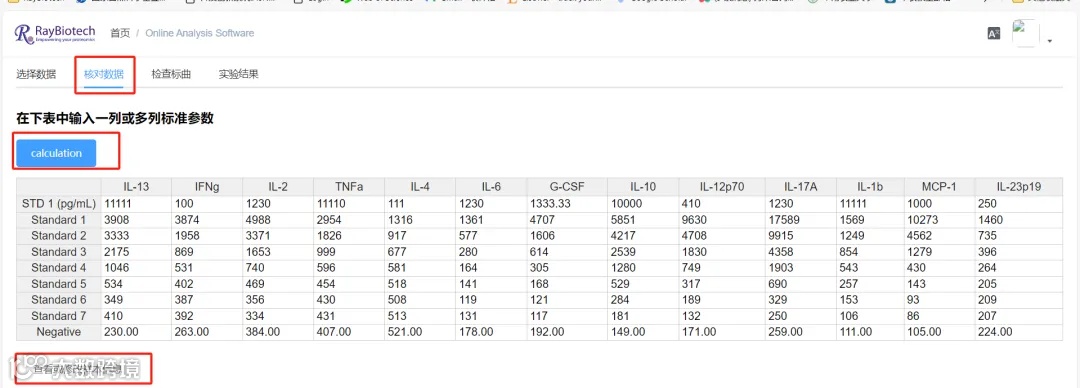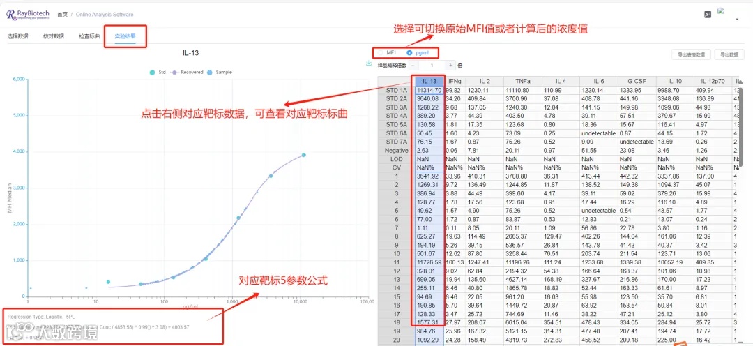 点击“实验结果”页面查看数据计算,结果页面左侧是标曲,下方有对应的参数,同时可以选择是否将样本点叠加上去。