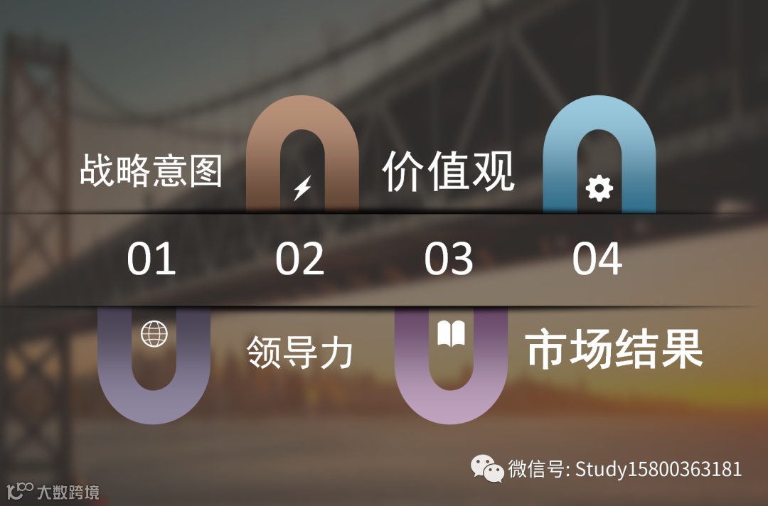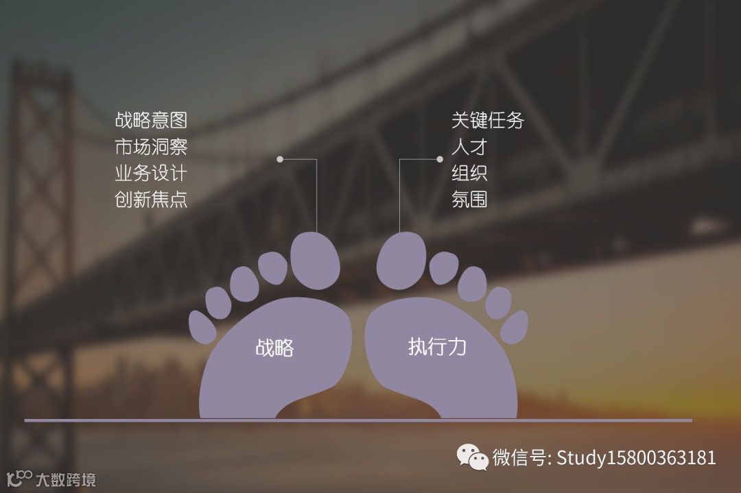 公司的战略目标在执行中被不断的实现,战略目标与执行力形成了公司的领导力,就像走路的两只脚.战略引导执行力.执行力不断的验证战略.在公司的价值观的指引下,推动公司的战略不断的发展.市场结果又给予战略方向的各种信号.