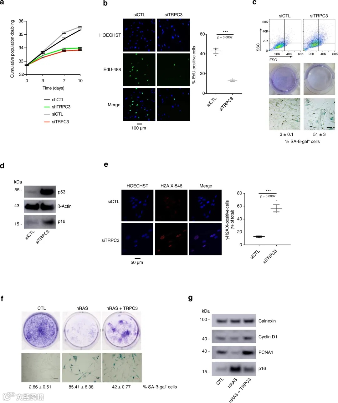 为了评估衰老过程中Ca2+通透性通道表达的可能变化,通过构建(人前列腺成纤维细胞(HPrFs)和前列腺癌相关成纤维细胞(CAFs)化疗诱导衰老、HPrFs氧化应激诱导衰老和MRC5成纤维细胞癌基因诱导衰老)实验模型证明,在增殖细胞中,TRPC3抑制IP3R介导的Ca2+释放,从而限制内质网-线粒体Ca2+转移,而衰老表型的发展与TRPC3下调有关。这反过来又导致线粒体Ca2+摄取/负荷增加、线粒体去极化、ROS产生增加和线粒体代谢改变,揭示了线粒体功能障碍的分子机制,有助于衰老的促肿瘤作用。(图1)。此外,研究团队通过对Trpc3基因敲除(KD)导致衰老诱导,发现其增殖停止(图2a、 b)、细胞体积增大和SA-β-gal活性增强(图2c),P53/P16通路的激活(图2d)以及异染色质灶的形成(图2e)这些结果表明TRPC3参与了衰老表型的建立。