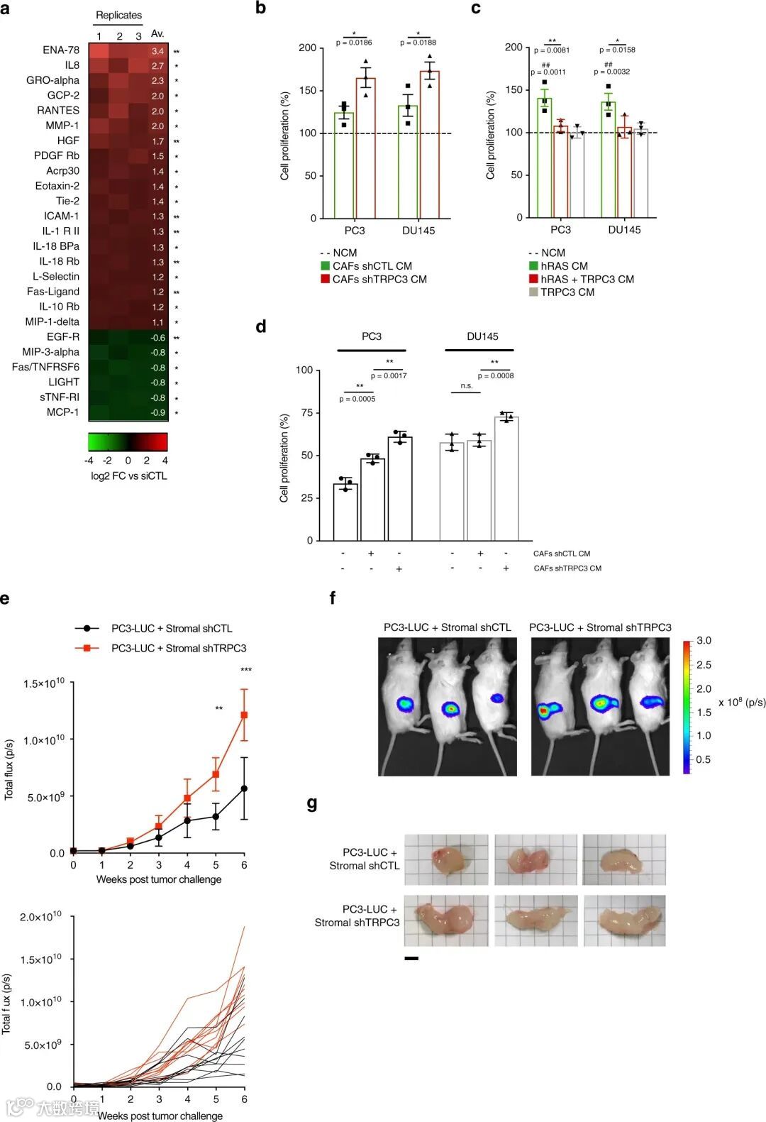 TRPC3下调的特点是肿瘤促进SASP,为了进一步检查TRPC3在衰老细胞中的过度表达是否会改变其SASP的表达(包括分泌的金属蛋白酶、炎性细胞因子,生长因子等蛋白),研究团队通过使用Human Cytokine Array C2000(AAH-CYT-2000)发现SASP富含可溶性因子,可促进(1)炎症相关的癌症进展和免疫逃逸,(2)癌细胞增殖和抗肿瘤治疗。结果表明,衰老与线粒体功能障碍相关,并以释放促炎性趋化因子、细胞因子和其他促肿瘤分子为特征(图8a–c)。除了促炎性趋化因子和细胞因子引起SASP的IL-1调节的诱导外,成纤维细胞在TRPC3下调后释放的一些可溶性因子,如IL-8、HGF、ENA-78、CXCL5、RANTES、PDGF-Rb和MMP1直接刺激肿瘤生长和抗化疗或促进体内肿瘤进展(图8b-g),其表明TRPC3下调引起的基质细胞衰老主要通过产生促炎症和促肿瘤SASP促进肿瘤进展。