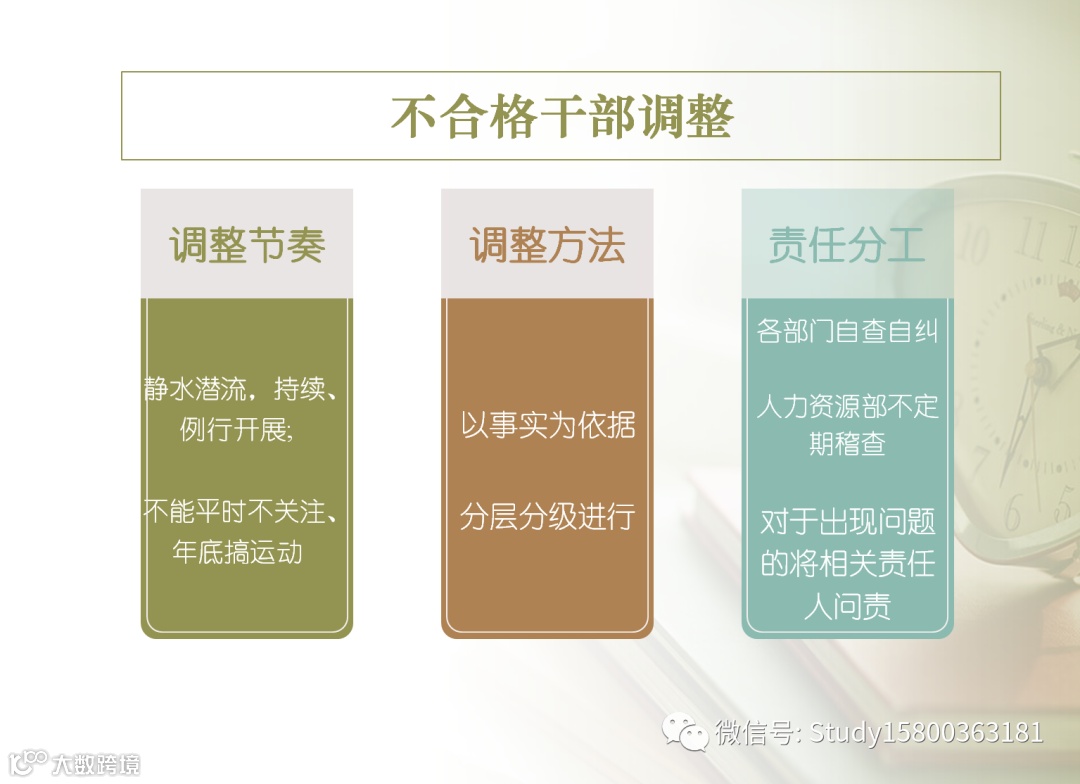 不合格干部的调整,也需要一个过程.通过调整节凑、调整方法、责任分工,把合适干部留住.不合格的干部进行调整.对我们HRBP来说,了解公司人才盘点及选拔激励的整个过程,对各部门工作的支持也是一个很好的开端.
