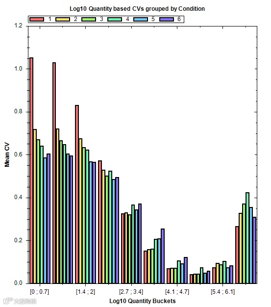 我们也可以基于Spectronaut中的CV分段可视化看到不同强度下的CV分布,从而间接考察定量的精确度,如下图,就可以验证刚才这几个例子是否代表整体结果。低丰度或高丰度(过载拖尾)的谱峰定量CV就是不那么理想。