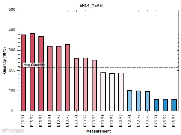对于低丰度蛋白,定量结果还是不尽如人意。如THRC_ECOLI(丰度800),则相对更低含量的几组结果则非常不准确或存在大量缺失值,尽管其趋势还是大致正确的。