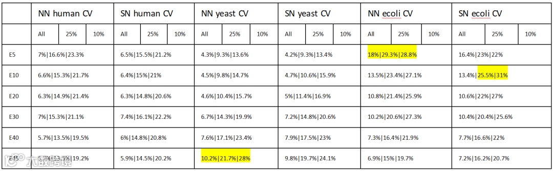 不同软件的定量结果精度相近,但准确性有所差异,我分别统计了DIA-NN(NN)和Spectronaut(SN)的人、酵母、大肠杆菌在不同掺比(E代表e.coli,E5:5%;E10:10%;E20:20%;E30:30%;E40:40%;E45:45%)。但进一步统计整体CV、25%(最低丰度25%蛋白的平均CV)、10%(最低丰度10%蛋白的平均CV)侯,就可以初步解答很多人关心的低丰度蛋白定量的问题。如下表1,可以非常清晰地看出大肠杆菌则因为鉴定数量少,低丰度蛋白统计更难以准确,CV在30%上下波动(很多人肯定不满意这个CV了)。同时我们要关心的是虽然人蛋白总体CV几乎都小于7%,但是低丰度蛋白,即使是总体含量最高的human的CV也大于20%。总的来说DIA-NN的定量CV还是略小于Spectronaut,但差别忽略不计。