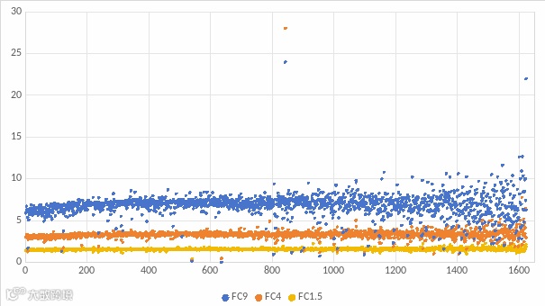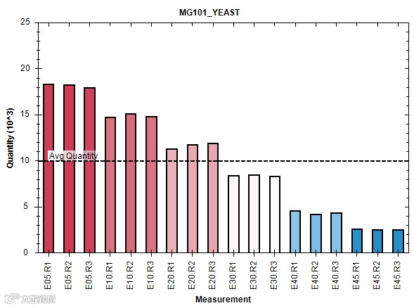 而如MG101_YEAST(定量丰度1.8e4)这个相对中等丰度的蛋白定量结果是正确的,不过像如此完美的结果总的来说比例不高,绝大部分9:1差异的蛋白定量都在7-8之间。