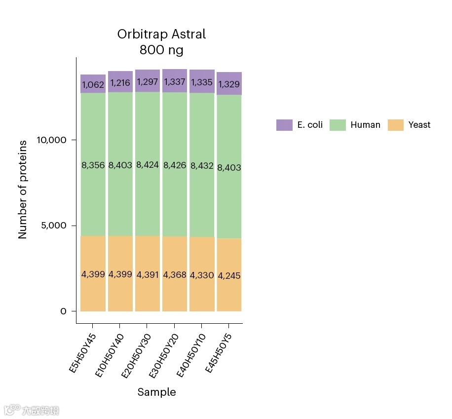 如何证明我们的定量结果有多可靠,我们无法先验的知道目标蛋白应该是如何变化的,但相对简单的做法就是人为掺入已知比例的蛋白进行定量结果测试,结果越接近预期,则说明定量越可靠。就如本文:混合3种几乎不同源物种的蛋白:人、大肠杆菌、酵母,其中保持人源蛋白含量不变,大肠杆菌和酵母的相对含量控制为5:45;10:40;20:30;30:20;40:10;45:5 6种比例,采用Astral 40分钟梯度检测,数据分析采用Spectronaut17(原文),Spectronaut19(本文)。如下图,可以看到大肠杆菌的检出率在高丰度人+酵母的存在下相对还是较低的,大约1300(30%理论蛋白质组4400),酵母则检测到约4400(70%理论蛋白质组6100)。因此大肠杆菌的定量准确性更能够反映我们对微量蛋白质的定量准确性焦虑。