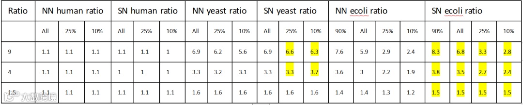 表1反映的是定量的精确性,那准确性呢,见表2:我分别统计了整体,最低25%,最低10%的平均定量差异ratio,人蛋白应该全部都为1,可以看到几乎都非常准确;而大肠杆菌和酵母则偏离正确结果相对都比较大,尤其是DIA-NN的定量精确度相对SN来说更是低了不少,在大肠杆菌中可以看到理论差异9倍的蛋白,即使信号最高的前10%蛋白(90%列)的平均定量比值也和理论值9差了约15%,最低丰度的那些蛋白更惨不忍睹,而SN在1.5倍理论倍数下定量较为准确,4倍差异的高丰度蛋白还算准确,9倍差异只能说最高丰度的那些蛋白还算可以了。