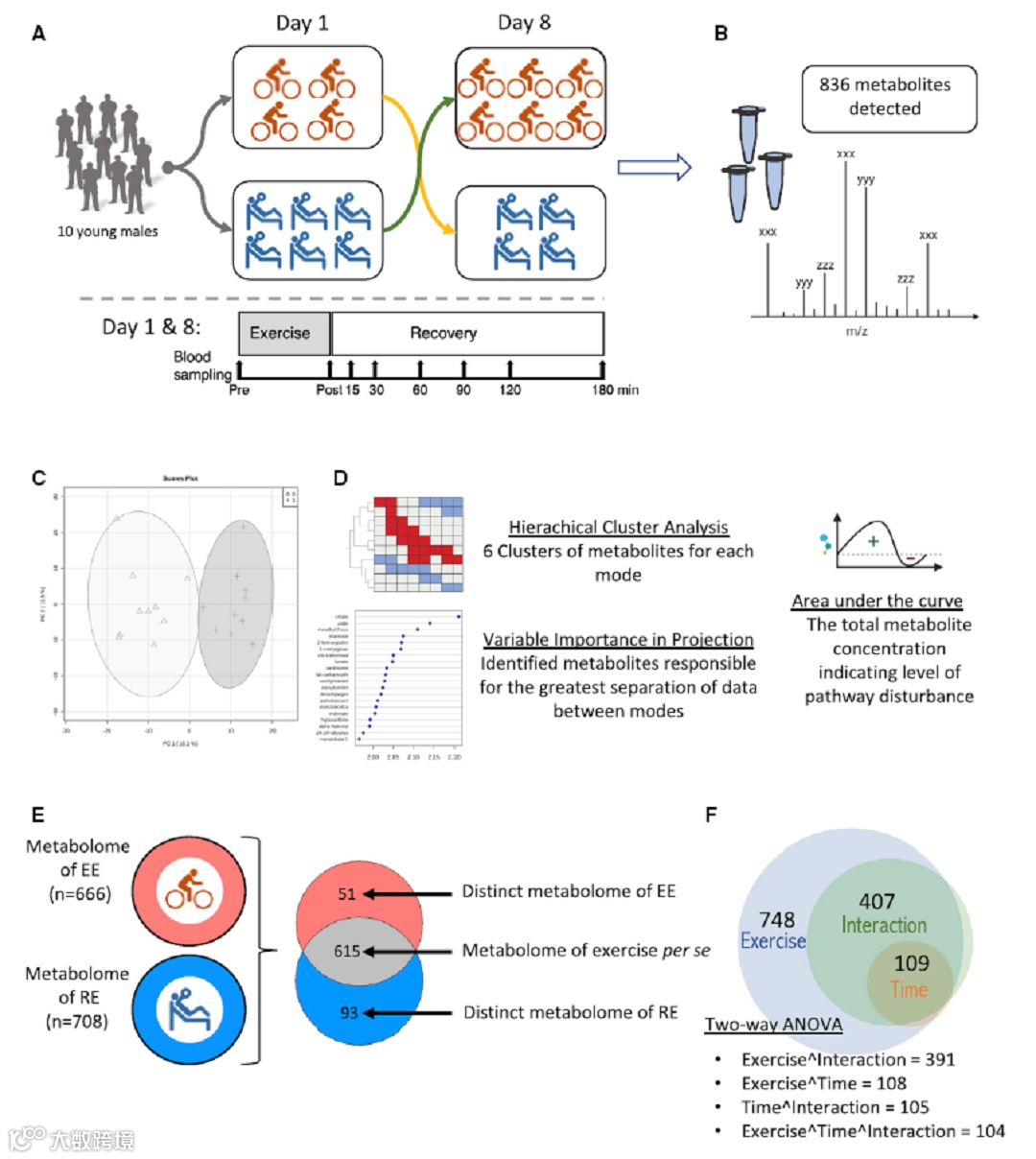试验选取10名健康的男性,分别进行耐力运动(EE)或抗阻运动(RE),休息1周后再进行另一种运动。分别在运动开始前、运动1h后以及运动完成后3h的恢复阶段,收集8份血液样本(见图1A),共160份样本,采用非靶向代谢组学LC-MS平台对血液样本进行分析,共检测到836种代谢物(图1B)。通过主成分分析(PCA),发现2种运动方式血浆代谢物存在显著差异(图1C)。