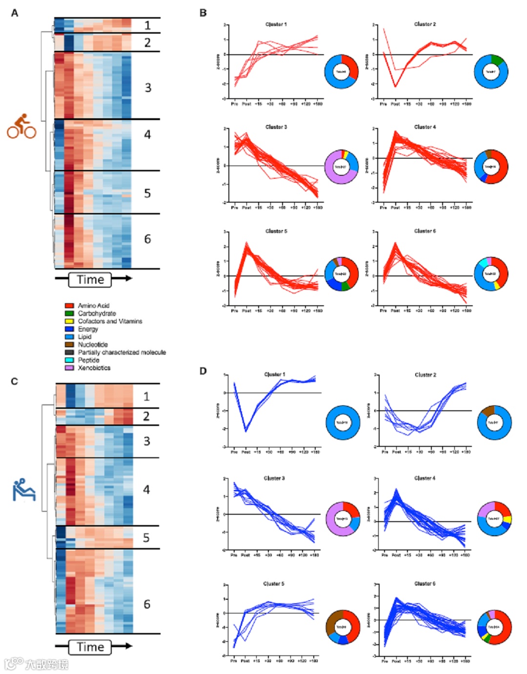 对每种运动方式随时间变化最明显的100种代谢物进行了聚类分析(图3A和3C),根据随时间的变化情况将代谢物分为六个主要组(图3A和3C),揭示了两种运动方式对代谢物的共同调节机制和特定调节机制(图3B和3D)。