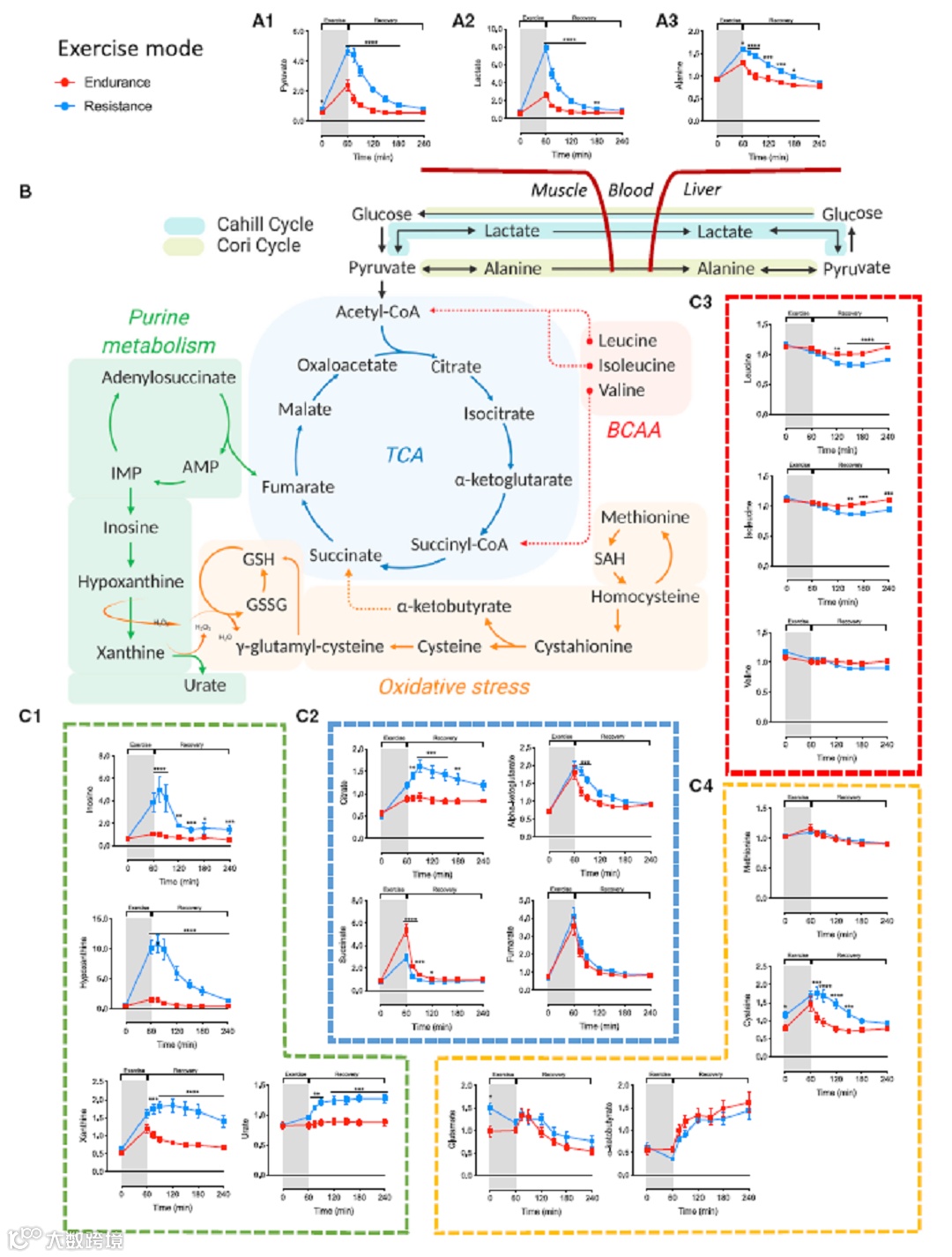 此研究,通过非靶向代谢组学LC-MS平台,测定了人类进行抗阻运动和耐力运动前后血浆中的代谢物,寻找到与两种运动方式有关的差异代谢物,并全面分析了代谢物随时间变化的情况,探索不同运动方式对人类血浆代谢物的影响,揭示了运动有利于健康的潜在机制。通过分析,发现这两种运动方式都会导致与细胞能量代谢途径,如糖酵解和三羧酸循环,以及全身底物代谢,如氨基酸分解和脂肪氧化等途径相关的代谢物发生显著变化。运动产生的乳酸有可能有助于人类提高记忆力和学习能力,琥珀酸可作为一种旁分泌信号,促进肌肉基质重塑和肌肉力量提高。色氨酸代谢产生的神经酸有利于保护神经元完整性和保持心理健康。