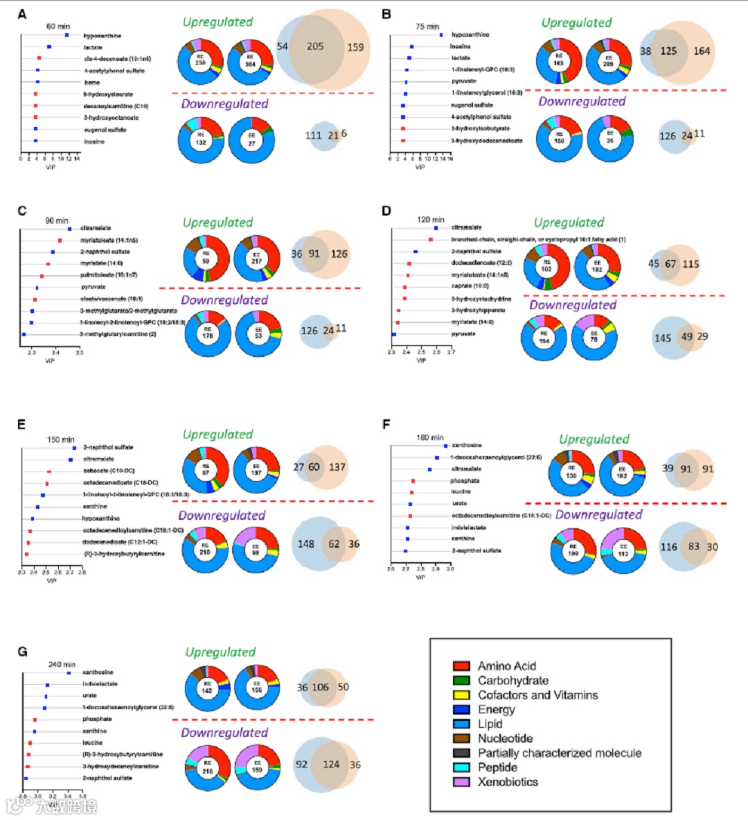 通过分析,发现在运动前后4h内,几乎所有检测到的血浆代谢物都发生了变化,EE和RE分别有666种和708种代谢物随时间的推移发生变化。其中,有51种代谢物是EE特异性的,93种是RE特异性的(图1E)。在运动结束后,与RE(259)相比,EE(364)有更多的代谢物上调。反之,与EE(27)相比,RE(132)有更多的代谢物下调(图2A)。在运动后3h的恢复阶段内仍保持相同趋势(图2B-G)。
